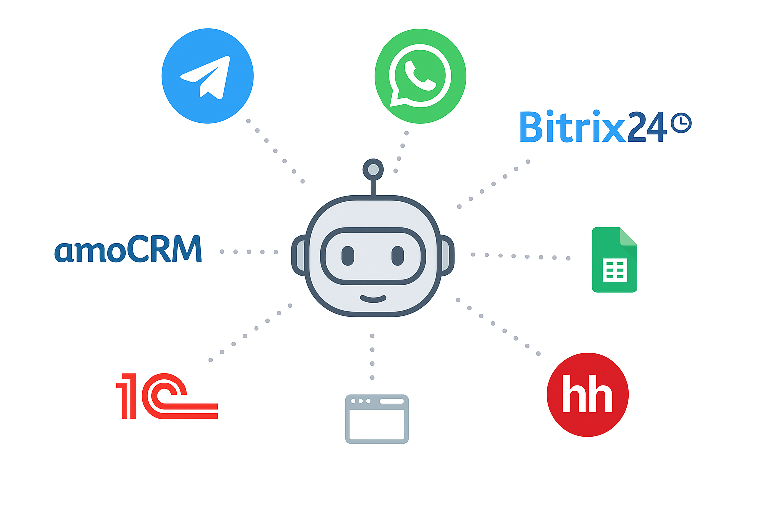 Telegram, WhatsApp, Bitrix24, amoCRM, 1С, Google Sheets, сайты, hh.ru,МАХ, Авито, Вконтакте, Дром, Работа.ру и любые другие сервисы с API